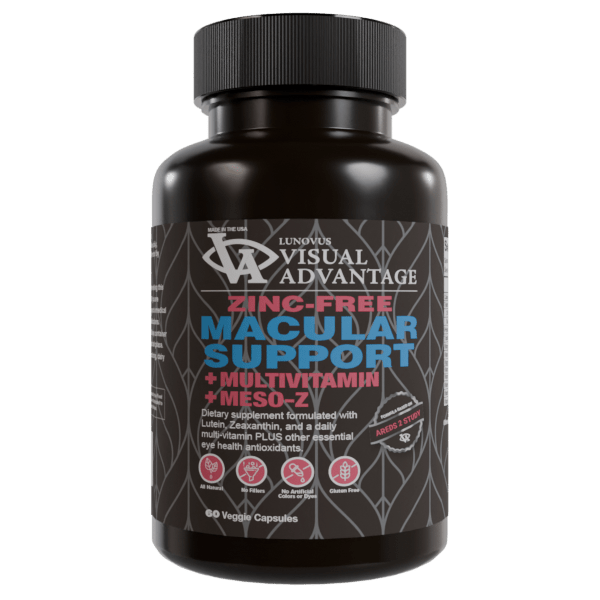 As the newest member of Lunovus’ diverse line of Visual Advantage vitamins, Zinc Free AREDS 2 +Multivitimin +Meso-Z was specially formulated for patients with lifestyles that demand optimal visual performance and those who need maximum protection against the damaging effects of blue light and light-induced oxidative stress.